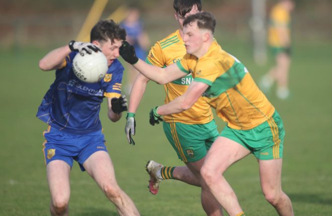 It’s always been said that goals win matches. So, when Ryan Hunter blasted home two goals in as many minutes and was upended a minute later for a penalty that Jack Flannery dispatched to the net, this game had suddenly swung in favour of the young lads from Glenties.