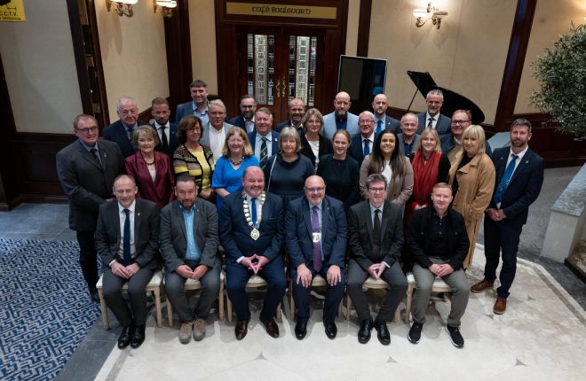 The delegation from Rudolstadt pictured at a welcoming reception hosted by Donegal County Council. Picture includes Cllr. Ciaran Blaney Mayor of the Letterkenny-Milford MD, Mayor of Rudolstadt Jörg Reichl, Elected Members of the Letterkenny -Milford Municipal District, visting delegation and education representatives.
