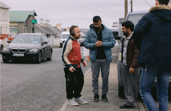Director Daniel Butler chatting to the cast on set in Fál Carrach.