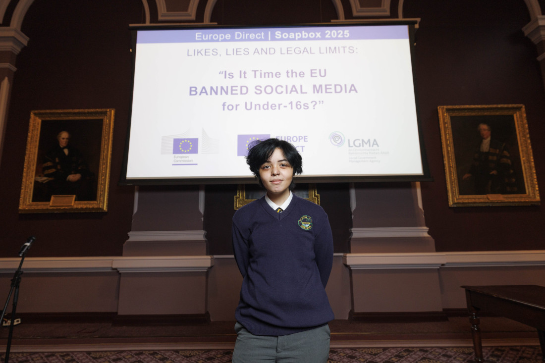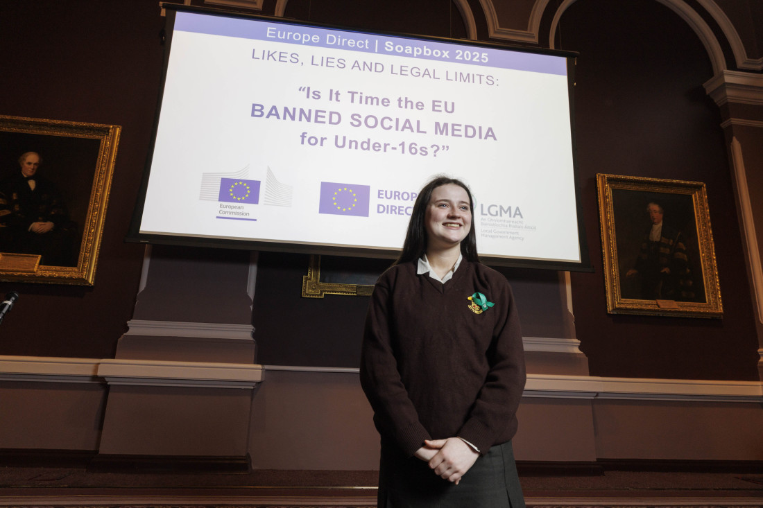 Cassie Lambe, from Loreto Secondary School, Letterkenny and Nicholas Govka, from Crana College, took part in this year’s competition, which challenged participants to argue for or against: ‘Likes, Lies and Legal Limits – Is it time for the EU to ban social media for Under-16s?’