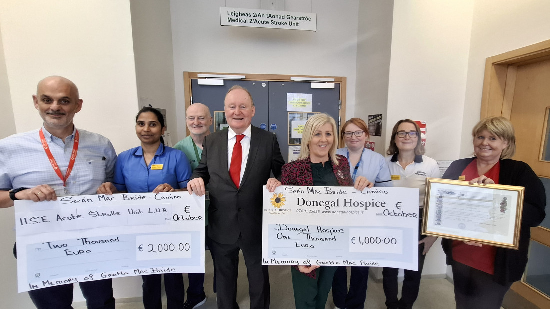 A Donegal man who undertook a fundraising walk of the Camino in memory of his late wife has presented a cheque from the funds raised to Letterkenny University Hospital and the Donegal Hospice.
