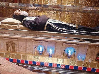 Padre Pio’s remains in a glass coffin in the Church of Saint Pio.