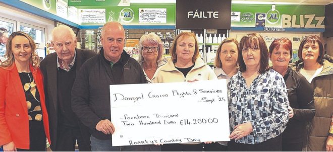 Kieran and Kathleen Roarty presenting €14,200 to Mary Coyle for the Dore based Donegal Cancer Flights and Services. Pictured are: Nóirín Uí Dhomhnaill, Jim Chonaill O’Donnell, Mary McFadden, Maureen Calilane, Máire Ferry and Marie Kearney. Photos: Tommy Curran