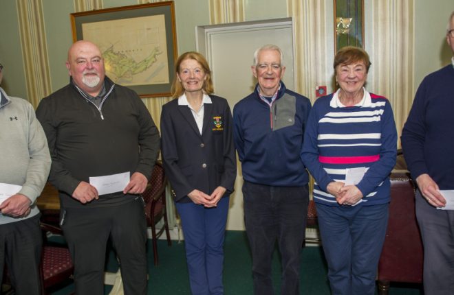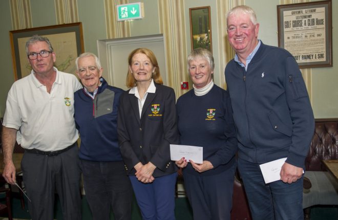 Winners at the Letterkenny Captain’s Drive-in – Joe Brown, Graham Donnell, Lady Captain Mena Delap, Captain Charlie McHugh, Maureen Sweeney, Robert Brown.