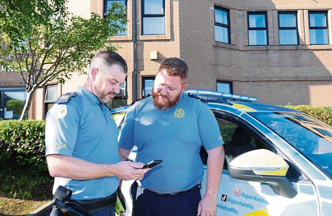 Garda Stephen Carroll and Garda Stephen Campbell look over their mobile phone technology.