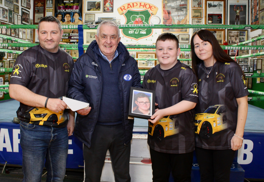 Patsy McGonagle of Finn Valley AC made a presentation to Christian’s parents, Gary and Aileen, and brother Riley at Raphoe Boxing Club this week.