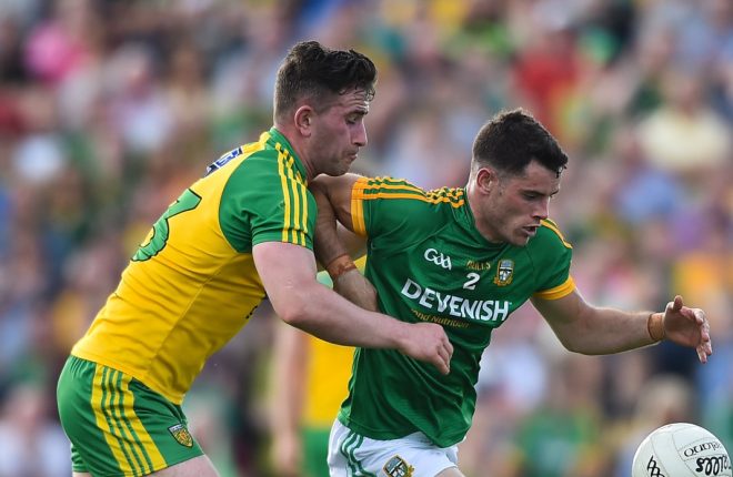 Donal Keogan of Meath in action against Patrick McBrearty of Donegal during the GAA Football All-Ireland Senior Championship Round 3A match between Meath and Donegal at Páirc Tailteann in Navan, Co Meath.