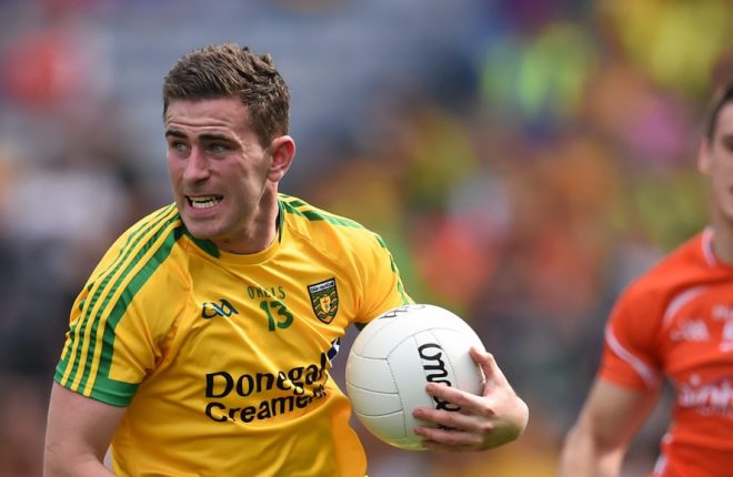 Patrick McBrearty on the ball against Armagh’s Mark Shields in 2014.