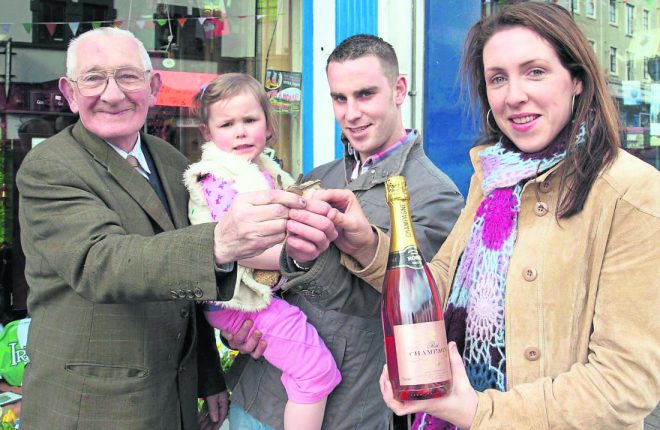 Gary Carr and Claire O’Donnell with their daughter Leah receiving the keys of their new house which they won in the St.Eunan’s GAA Draw. The lucky family are pictured with Letterkenny shop owner Joe Gallagher who sold them the winning ticket. The year was 2008.