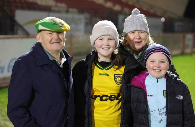 Three generations of the Campbell family at the Donegal game in Omagh. John Joe Campbell with his daughter Kathleen and his grandchildren Elisa Jane and Isobel.