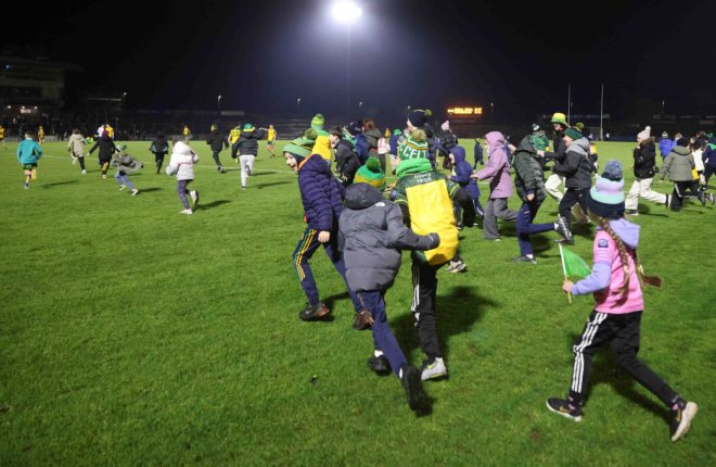 Young Donegal fans rush onto the pitch in Omagh following their team’s win over Monaghan.