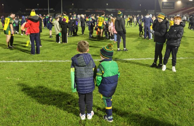 Two young Donegal fans watch on as Donegal players are surrounded at the end of Saturday’s game.