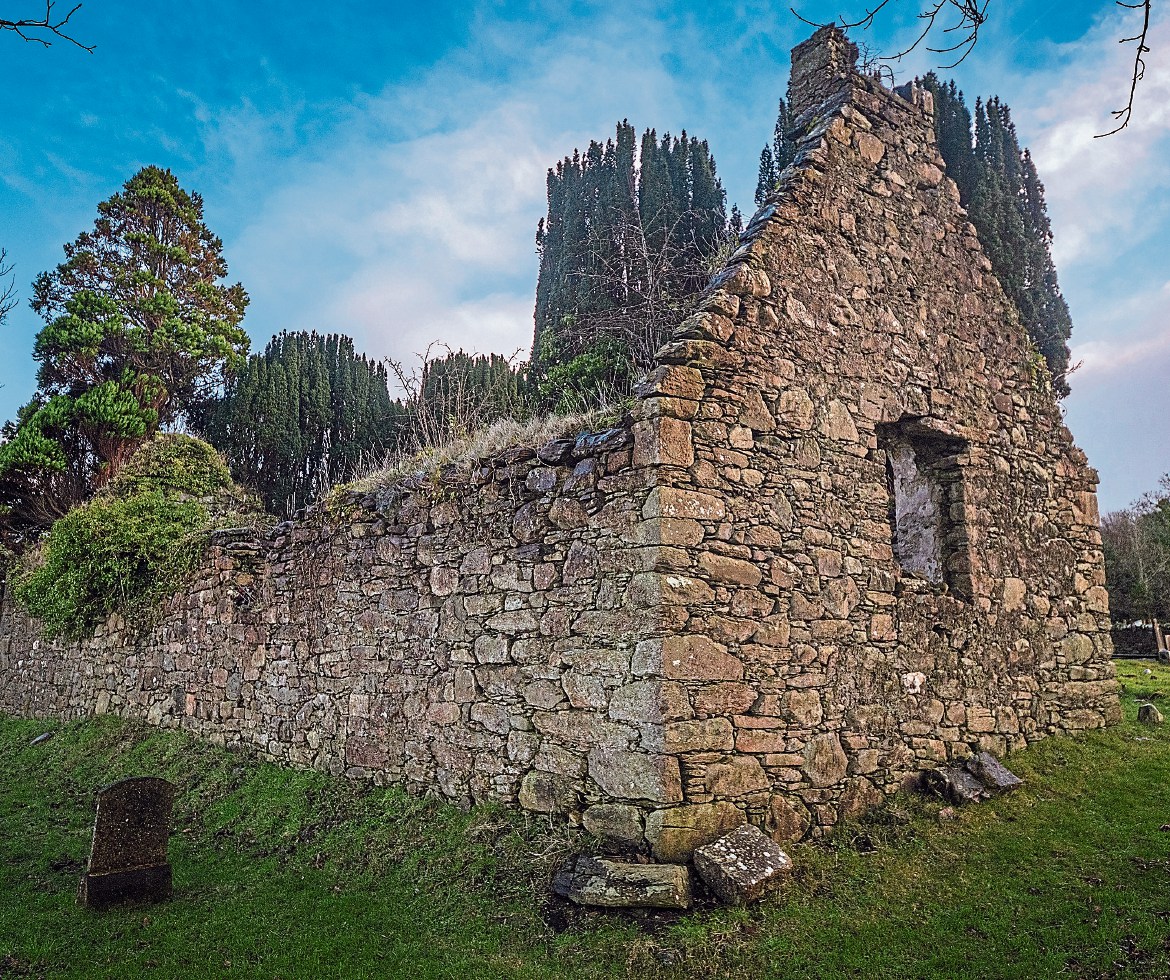 Old Leck graveyard is roughly rectangular, enclosed by low rubble stone walls. Its centrepiece is the ruin of the old church, which was built around the year 1500.