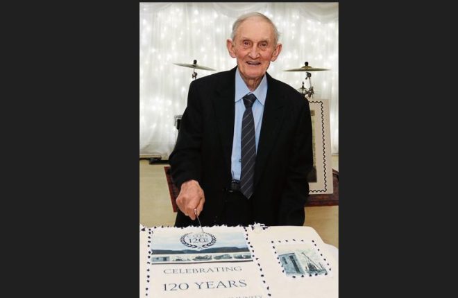 92 year old Jimmy Durning cutting the cake at the Cope’s 120th anniversary, 45 years after his father cut the cake for the 75th anniversary.
