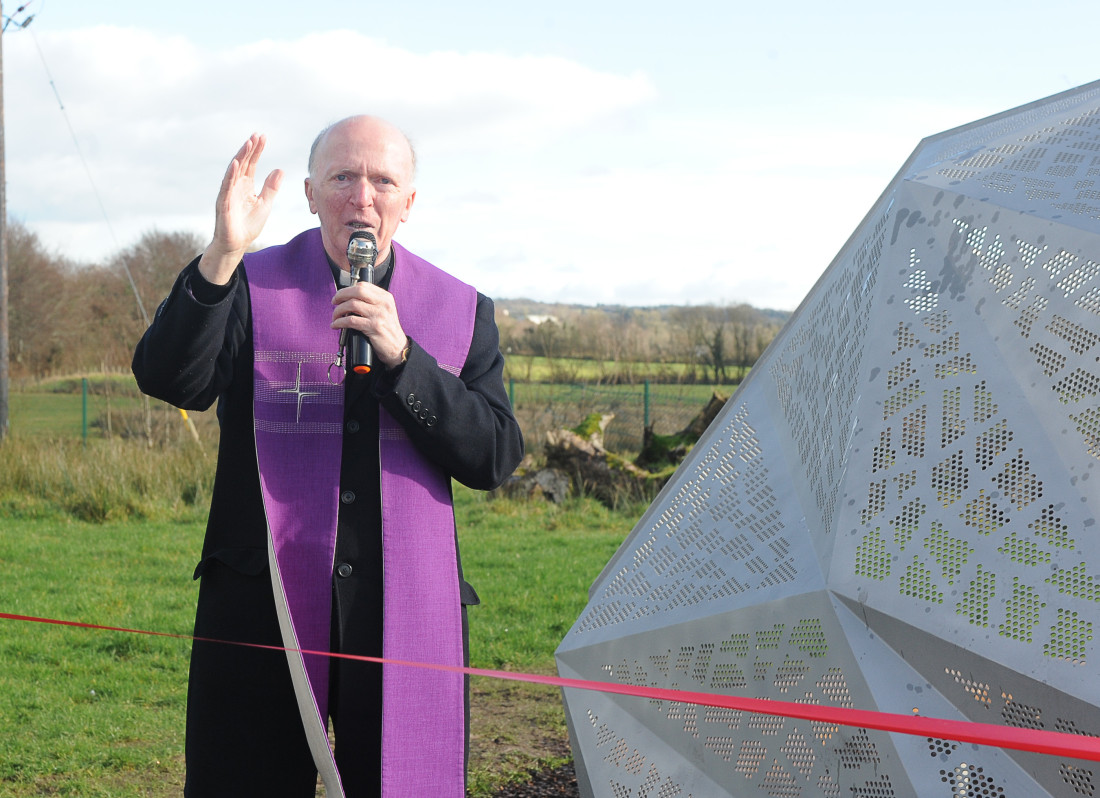 Fr Kieran McAteer blesses the outdoor learning space which has come to be known as ‘The Den’ at Scoil Mhuire on Friday last. Photo: Gerard McHugh