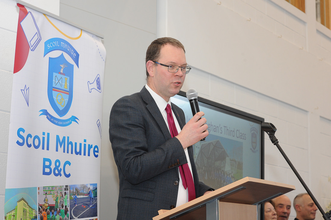 Eoghan Roarty, Principal of Scoil Mhuire Stranorlar, pictured speaking at the school’s event last Friday. Photo: Gerard McHugh
