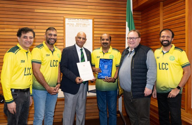 Cllr Michael McBride pictured with Sudheesh Satheeshan, Secretary; Rajesh Nair, Chairman; Bobby Rao, Former International Cricketer; Bhupesh Puri, Treasurer; and, Rammohan Sama, Founding Member at the Mayor’s Reception for Letterkenny Cricket Club.