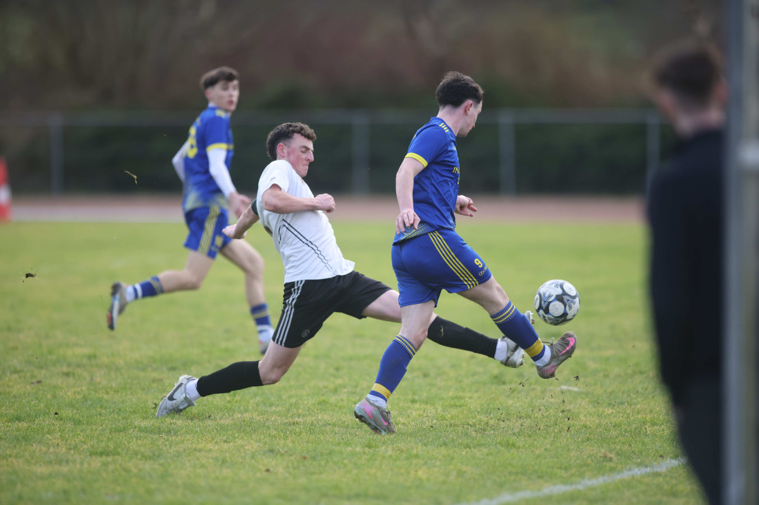 Olly Coyle played a great ball across the face of goal but the on-rushing Tiernan Diver was unable to make contact with the ball and it was safely dealt with by the Loreto Milford defence.