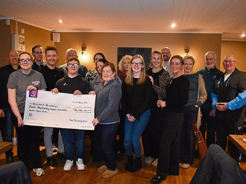 Presentation of €4,702 raised by the Doe Amateur Swimming Club during its 48th New Year’s Swim 2026 in aid of the Bluestack Special Needs Foundation. Pictured at the presentation (right to left): Denis McGee, Shauna McFadden, William Sheridan, Lee Gooch, Anthony Gallagher (back), David Crawford (front), Catherine Deasley (back), Mairead Collett, Annmarie Campbell (front), Mary Teresa McTeague (back), Laura Cassidy, Anna Good, Greg Hughes, Evelyn Gamble, Sarah Smith, Noel Brennan and Drew Campbell. Photos: Moses Alcorn