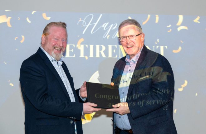FAMIY members, friends and former work colleagues and board members gathered in the Mount Errigal Hotel in Letterkenny last weekend to pay tribute to the manager of Lifford Credit Union, Mark McClay, who retires after an amazing 41 years of service.