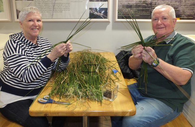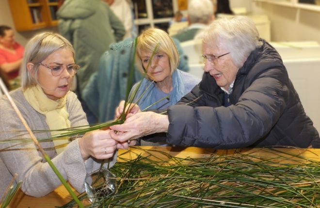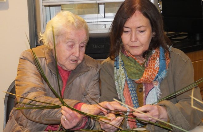 Mary Le Raux showing the different steps in making a cross to Dorothy McGinley and her mum, Rita.