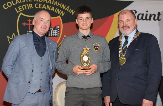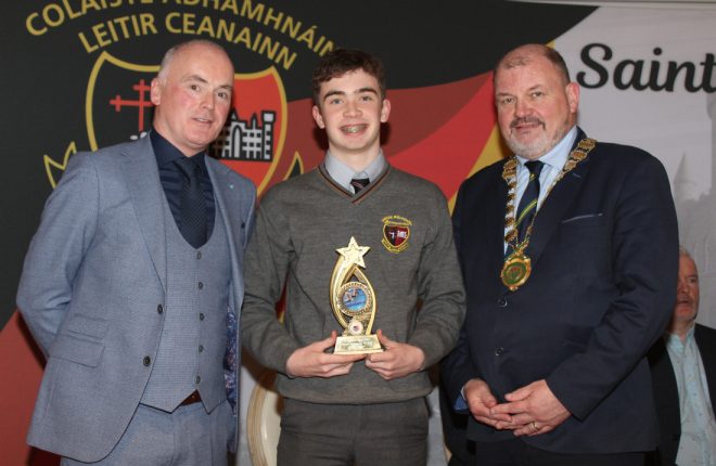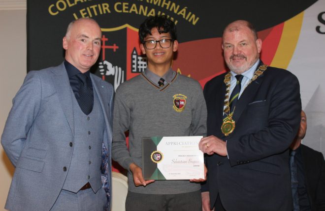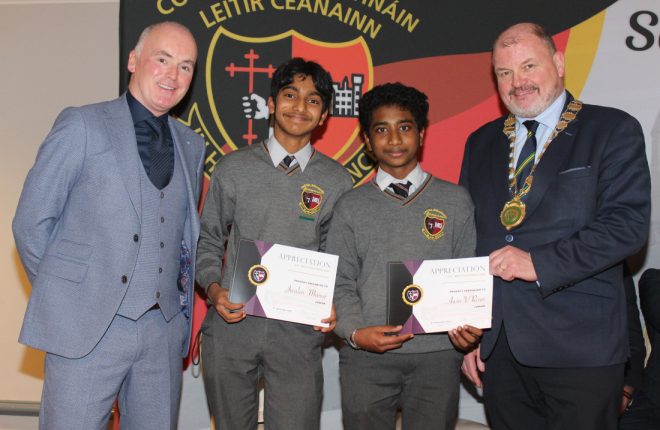 Special guest on the night was Letterkenny-Milford Municipal District Mayor, Cllr Ciaran Brogan and he is pictured along with the students with school principal Mr. Damien Mc Croary.
