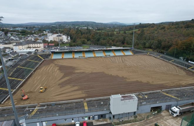 The resurfacing of Donegal’s premier GAA ground is part of a €500,000 overall redevelopment which began in April. The project also includes improvements to floodlighting, drainage, and accessibility.