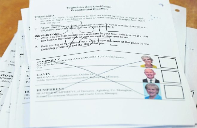 Some of the spoiled votes at the presidential election count in the Aura Letterkenny on Saturday.