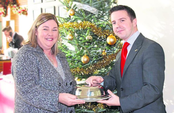 Kathy O’Connor and Brian Gleeson, general manager, Radisson Blu Hotel, Letterkenny, who provide the Christmas dinners funded by local Chamber businesses in 2009.