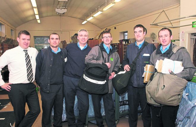 Letterkenny Post Office staff members, from left, Paul Herrity, deliveries service manager, with postmen, Eugene Sullivan, Paul Crampsie, Phelim McClafferty, Aaron Baxter and Dara Kely.