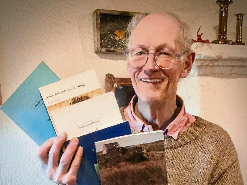 Talented artist Ian Gordan holds aloft books of poetry written by Aidan Hayes.